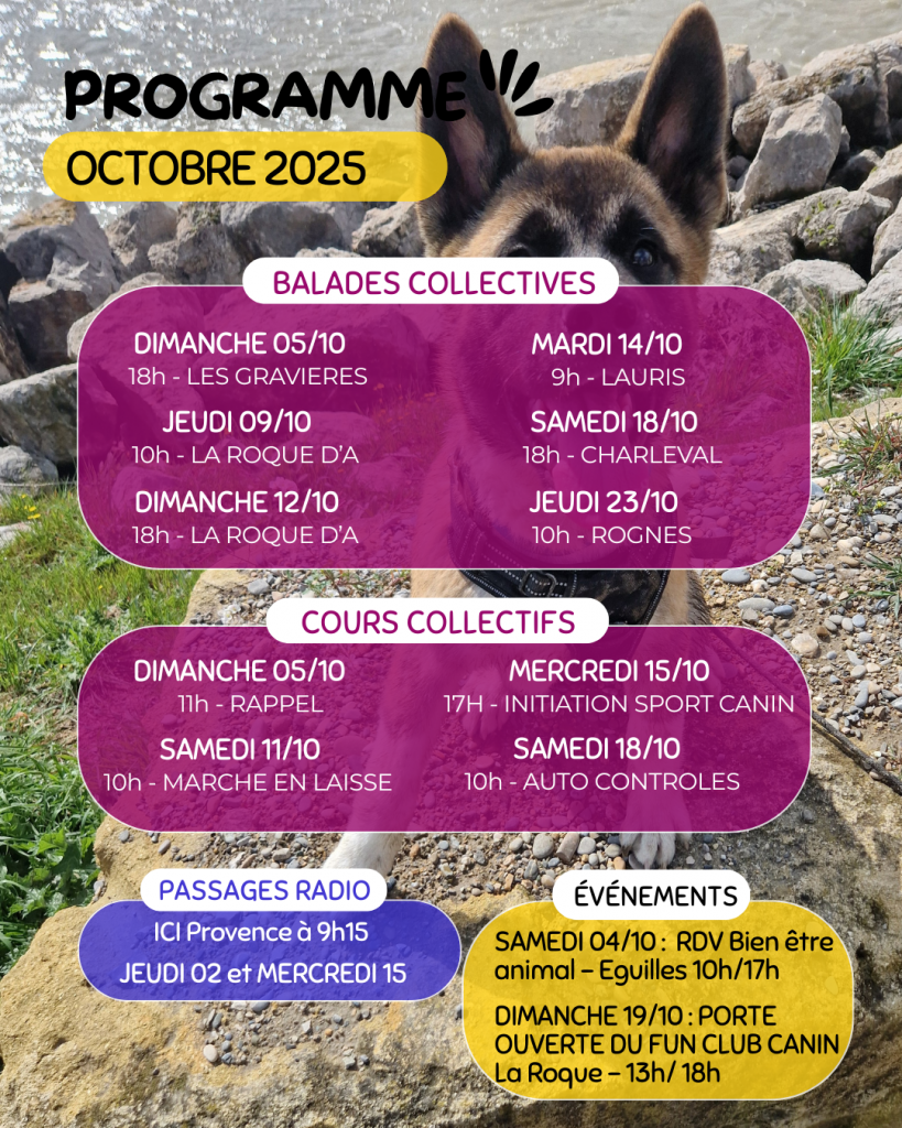 Il y a tellement d'activités à partager avec son compagnon à quattre pattes ! Afin de renforcer votre relation et de partager des moments exclusifs je vous propose ponctuellement stages ou journées découvertes thématiques.