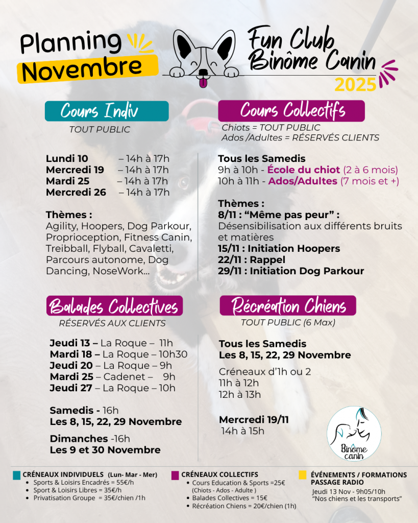 C’est le cœur de l’aventure Binôme Canin : des activités fun (agility, hoopers, parkour, jeux olfactifs…) ouvertes à tous les niveaux. Idéal pour renforcer votre lien, lâcher prise et vivre un vrai moment de complicité.