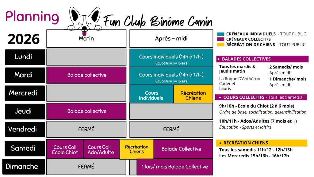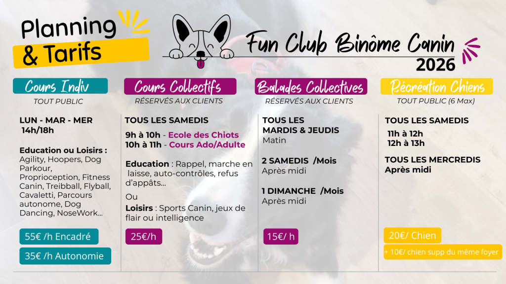 Mon approche ? Ludique, par la motivation, centrée humain-chien. On n’est pas là pour « dresser » ton chien, mais pour vivre avec lui, apprendre à parler « chien », et lui donner envie de te suivre partout.